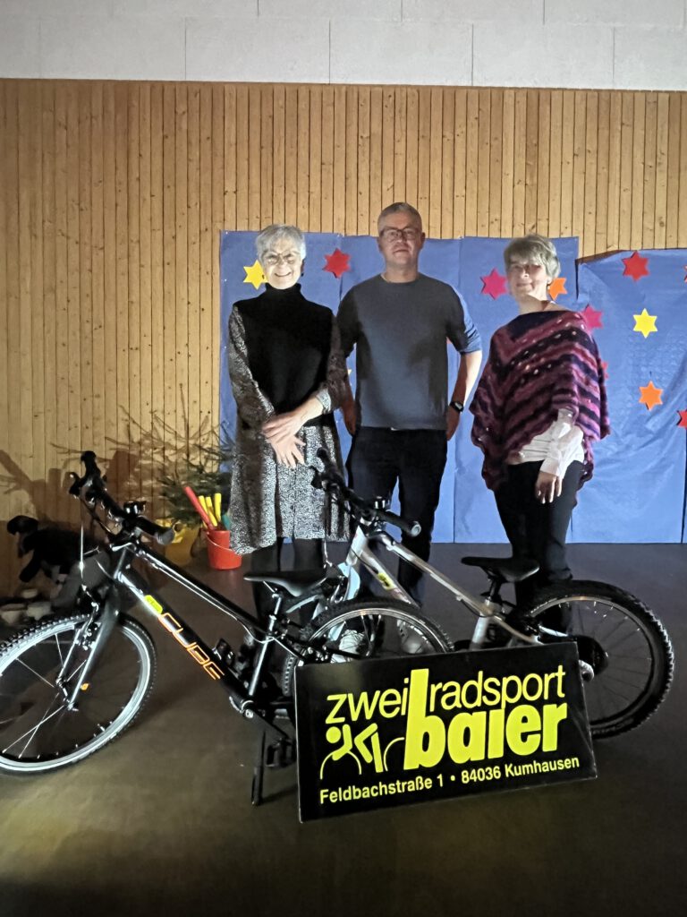 Um bereits in der zweiten Klasse mit der Fahrraderziehung starten zu können, regte eine Lehrerin die Anschaffung eines kleineren Fahrrads an, da die im September übergebenen Mountainbikes für einige Kinder noch zu groß waren. Innerhalb kürzester Zeit konnte mit der Firma Zweiradsport Baier eine engagierte Unterstützerin für dieses Projekt gewonnen werden. Dank der Familie Baier war es sogar möglich, zwei nagelneue Fahrräder in der Größe 20 Zoll zu organisieren. Diese wurden feierlich im Rahmen der Weihnachtsfeier der Grundschule übergeben und vom Publikum mit begeistertem Applaus gewürdigt.